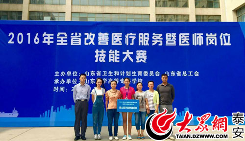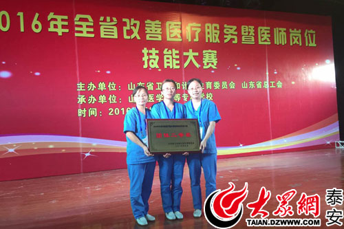 大众网泰安9月22日讯(记者 刘辉 通讯员 胡隽楠)为进一步改善人民群众就医体验,提高医疗人员岗位技能水平,9月19日至20日,山东省卫生计生委、省总工会联合举办的“2016年全省改善医疗服务暨医师岗位技能大赛”在济南举行。比赛中,泰山医学院附属医院代表队凭借优异的理论成绩和规范娴熟的技能操作勇夺团体总分第二名,被授予团体二等奖;参赛选手武伟华、李然然、樊明英分别获得内科组、儿科组、妇产科组个人二等奖,并被授予“全省改善医疗服务岗位技能竞赛能手”称号。