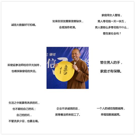 延参法师爆出十大“诚信金句” 而在两天前,延参法师就在微博上为诚信话题预热,这一下还真不得了,吸引了一大批平台官微参与讨论,借贷宝、爱鲜蜂、360行车记录仪、阿里文学纷纷向大师请教,面对纷繁复杂的世界,如何做好诚信这件小事。据了解,#延参法师谈诚信#微博话题已获得978万次阅读量、2.3万次以上讨论,充分显示了“诚信”话题在当今时代的共鸣效应。