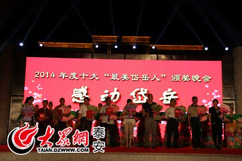 大众网泰安6月5日讯(记者 王洪玲)6月5日晚,2014年度十大“最美岱岳人”颁奖晚会在岱岳文化广场举行,现场为10位“最美岱岳人”获得者颁奖,他们都是我们身边最平凡的人,但他们却在平凡中,演绎了中华民族传统美德,展示了传统道德风范。