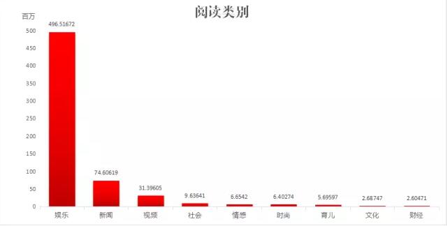 数据显示,在所有与事件相关的文章中,除娱乐类内容收割近 4.97 亿流量外,新闻、情感、社会、体育、育儿类内容同样斩获颇丰,以下为阅读量:新闻类(71438280)、视频(31396050)、社会(9636410)、情感(6654200)、时尚(6402740)、育儿(3380920)、文化(2687470)、财经(2604710)。