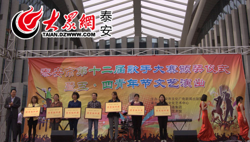 “五四青年节”来临之际,为弘扬爱国、民主、勇于探索和创新的五四精神,丰富活跃基层群众文化生活,进一步推进公共文化服务体系建设,营造欢乐、祥和蓬勃向上的节日氛围,大力倡导社会公益、文化惠民的宗旨,让优秀文艺作品惠及更多的市民百姓,泰安市第十二届歌手大赛颁奖暨“五四”青年节文艺演出于5月3日下午在泰安文化艺术中心广场隆重举行。泰安市有关领导、文广新局、文化艺术中心、华通集团相关领导出席颁奖仪式并为获奖单位及个人颁奖。