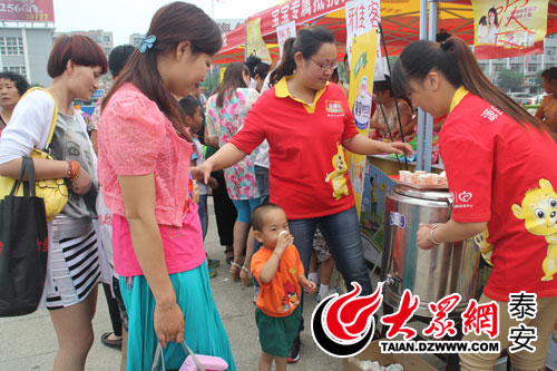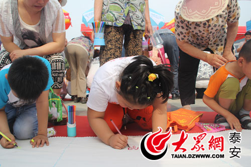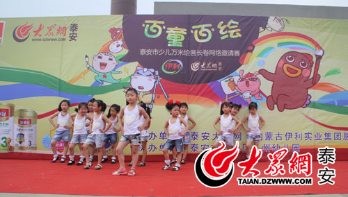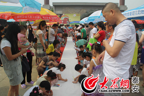 6月8日,由泰安大众网及伊利奶粉主办的“百童百绘”泰安市首届百米长卷绘画邀请赛第二站来到了泰安美丽的南湖公园,来自九州幼儿园的百余名小朋友在百米画布上现场作画,描绘心中美好愿景。