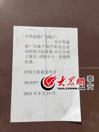 宁阳县公安局经侦大队已贴出通知,要求欠款户到经侦大队报案