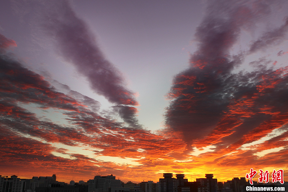 8月18日清晨5时,“火烧云”映红了北京天空,秋风扫去阴霾与湿闷的天气,带来秋高气爽的黄金季节。中新社发 任晨鸣 摄