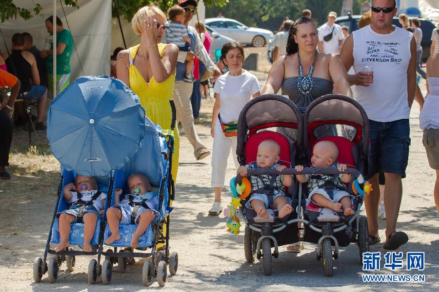 8月19日,两对双胞胎参加在匈牙利中部小城埃尔奇举行的第14届全国双胞胎聚会。 新华社发(弗尔季·奥蒂洛摄)