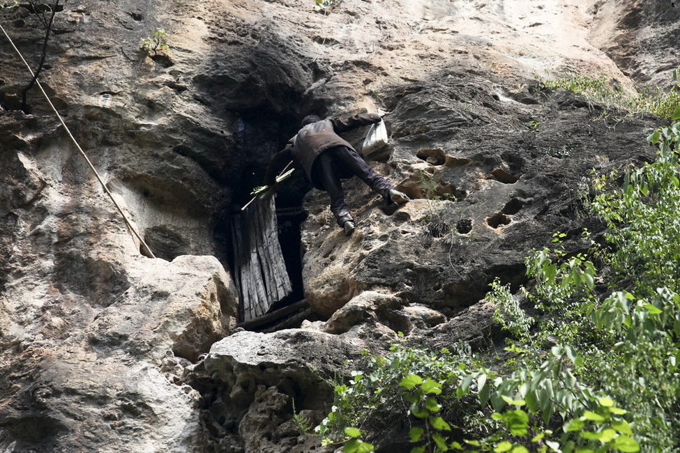 在陕西省商洛市山阳县高坝店镇高坝街村封家湾组,有一个当地人称作岩屋沟的山沟,一处峭壁上的山洞内,住着54岁的男子封明山,他已在这个山洞生活了20多年。图为封明山身手矫健地攀岩进他居住的洞穴。图/文华商报黄利健