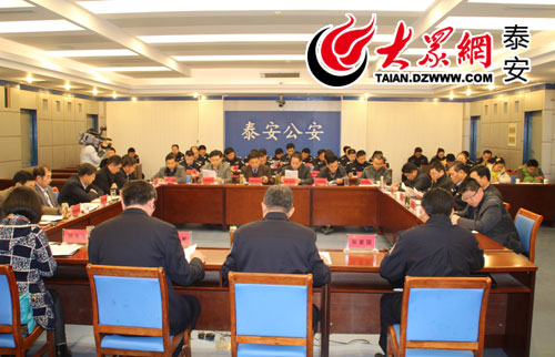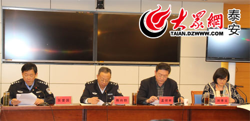 11月18日,泰安市召开打击食品安全违法犯罪“百日行动”安排部署工作会议,泰安市政府党组成员、食品安全委员会副主任、公安局长鞠向群;泰安市食品安全委员会办公室主任、食品药品监督管理局局长孟祥彬;泰安市公安局党委委员、治安支队支队长张爱国;泰安市食安办副主任、食药监局副局长刘秀文参加此次会议。参加会议的还有水利局、农业局、卫生局、林业局、畜牧局、高新区、泰山景区分工负责人员及县市区食安办主任、高新区市场监管局、泰山景区食品药品监管局负责人员。