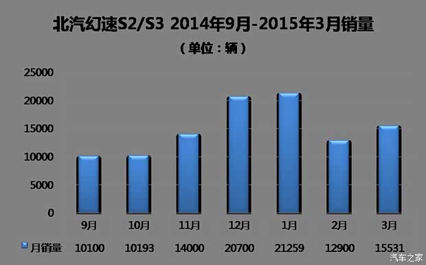 近日,中汽协公布2015年3月销量成绩单,黑马车企北汽幻速再传捷报。数据显示,2015年3月,北汽幻速共计销售17189辆,其中SUV销售15531辆,继续稳坐热销SUV榜单前十;上市不久的MPV北汽幻速H2销售1658辆。1-3月,北汽幻速累计销售51804辆,相当于去年全年销量的一半。
