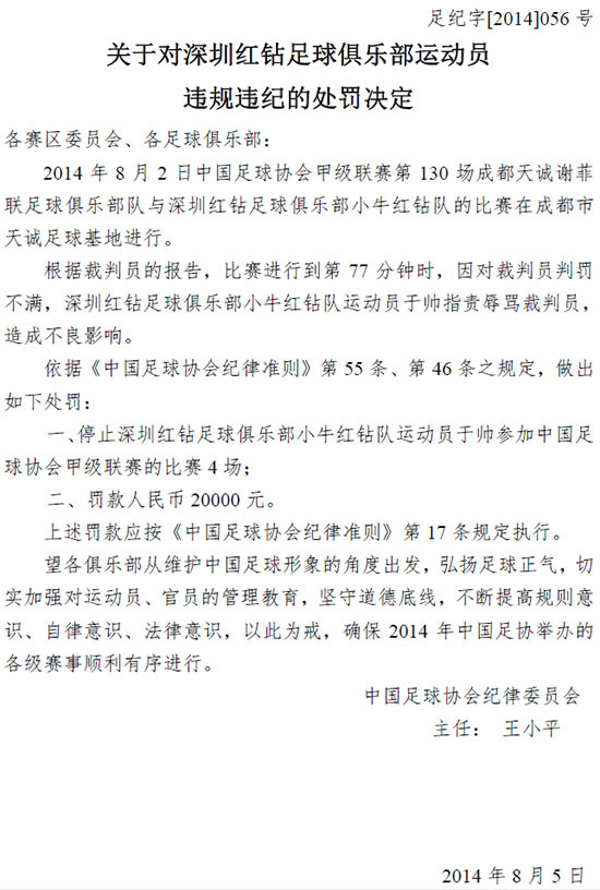 北京时间8月6日,中国足协开出一系列罚单,其中北京国安队员李提香因为在与阿尔滨的预备队比赛中辱骂指责裁判员,被禁止参加预备队联赛四场,罚款20000元。其他被处罚的都是中甲球队队员,北京理工队王超因为在与武汉卓尔的比赛中,使用过分力量击打对手,被禁赛三场罚款15000万。