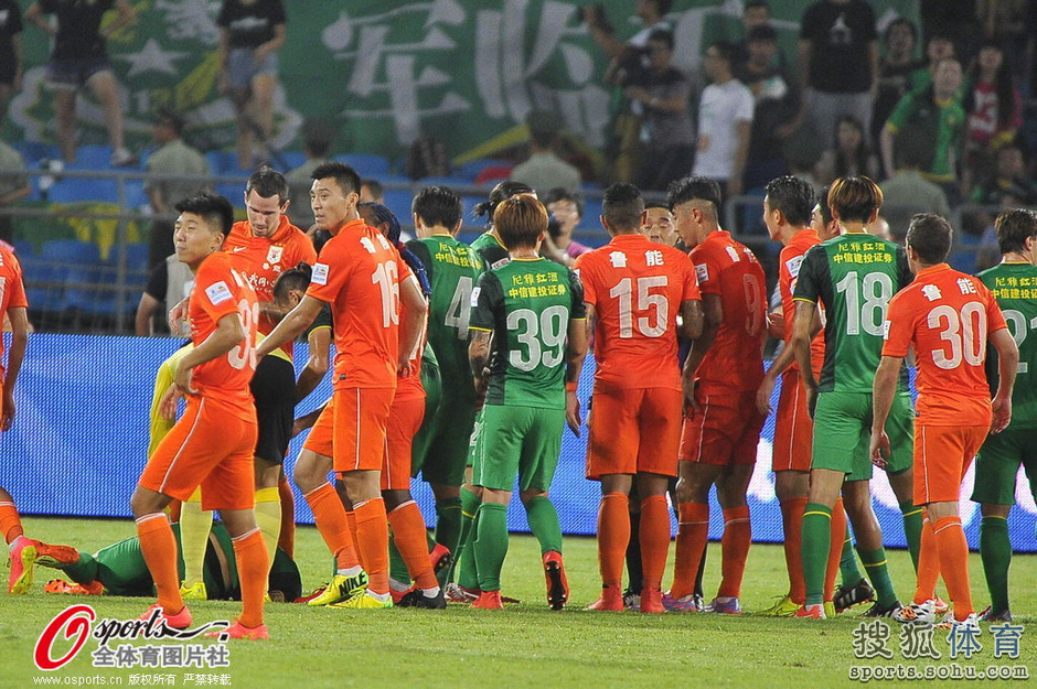 2014年8月6日,2014年足协杯1/4决赛:北京国安vs山东鲁能 现场就裁判判罚引激烈冲突“北周挺”“东戴琳”相继染红。