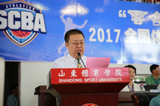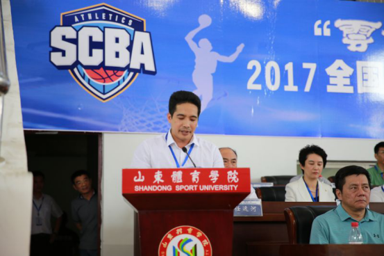 王毅代表山东体育学院致辞。他指出,始建于1958年的山东体育学院是山东省唯一一所独立设置的普通高等体育院校。建校近60年来,学校植根齐鲁沃土,秉承体育精神,弘扬“坚卓竞远”的校训和“严勤创实”的校风,已发展成为拥有济南和日照两个校区,办学软硬条件完备,社会声誉优良的应用型专业体育院校,全日制在校生达1万多人,为国家培养了3万余名优秀毕业生。进入十三五以来,学校遵循“对接需求、协同创新、集聚特色”的发展理念,积极对接国家战略需求和体育事业核心业务发展需求,协同校内外各类优质资源,突出体育专业院校的本体特色,推进以需求为导向的人才培养模式转型,坚定不移地走特色鲜明的内涵发展道路。他强调,按照国家体育总局“一校一品牌,一校一赛事”的发展要求,去年承办了全面改革后的首届全国体育院校篮球联赛,取得了理想效果,社会反响良好。今年,联赛再次升级,实现首度扩军、首次由国家篮球学院参与承办比赛、首次大数据跟踪分析、首次全网化报道和全方位推广等多个突破,SCBA一定会越办越火,一定会发展成为中国篮球的重量级赛事。他表示,承办好本次比赛是山东体育学院、国家篮球学院和山东泽辉体育文化管理有限公司共同的责任和使命,感谢联赛主办方和上级主管部门的充分信任和鼎力支持,感谢联赛独家商务运营合作伙伴北京辉耀百年体育文化发展有限公司,感谢比赛冠名赞助商山东雲亭食品有限公司,感谢参赛兄弟院校的友情支持。山东体育学院将发扬好客山东人的周到热情,努力把联赛办成“激情、创新、奋进”的赛会,让大家充分感受篮球运动的魅力和快乐。