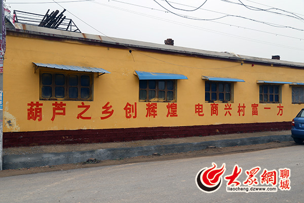 "在家上网开店铺,家庭事业两不误"、"葫芦之乡创辉煌,电商兴村富一方"、"烙出美丽乡村,淘来幸福生活",村中墙壁上随处刷着类似的标语。村中央关于葫芦村的展示牌中,标语中明确提出要打造淘宝第一村的的口号。