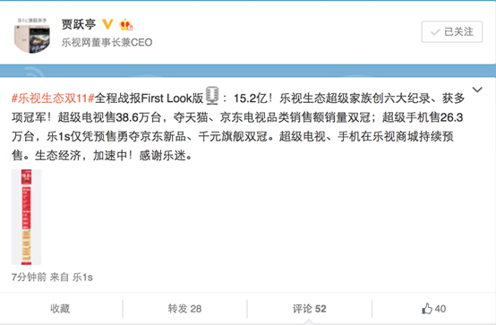 12日凌晨1点左右,乐视创始人贾跃亭微博公布全程战报First Look版:“15.2亿!乐视生态超级家族创六大纪录、获多项冠军!超级电视售38.6万台,夺天猫、京东电视品类销售额销量双冠;超级手机售26.3万台,乐1s仅凭预售勇夺京东新品、千元旗舰双冠。超级电视、手机在乐视商城持续预售”。