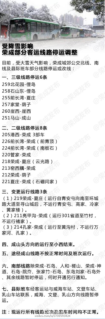 记者获悉,目前,受大雪天气影响,荣成城郊公交北线、南线及县际班车部分线路停运或改线。今天乘坐公共交通出行的市民请随时关注@荣成发布,或出行前拨打荣成公交运务科电话0631-7506227、荣成客运站电话0631-7571192咨询。