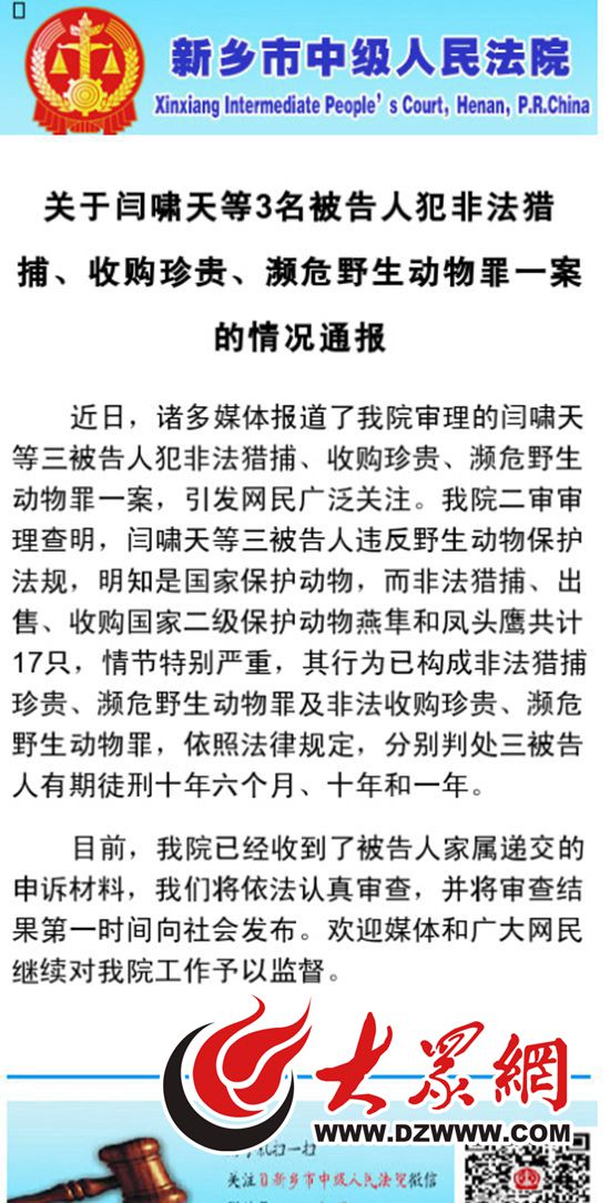 针对闫案引发的广泛关注,12月3日,新乡市中级人民法院官方微博@新乡中院发布《关于闫啸天等3名被告人犯非法猎捕、收购珍贵、濒危野生动物罪一案的情况通报》,明确重申了法院对于该案的二审结果,并称已受理被告人家属的再次申诉。