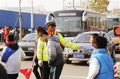 昨日中午,泰山学院附属中学门前,交警护送学生过马路。本报记者陈阳摄