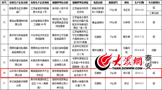 大众网泰安12月6日讯(记者 聂艳艳)近日,国家食品药品监督总局网站公布了2014年度第二次产品抽检结果,本次抽检的调味品包括酱油、食醋、酱及酱制品、固态调味料、半固态调味料、液体调味料、食用调味油、味精、鸡精调味料等。共抽检调味品2610批次,覆盖全国30个生产省份的1240家企业。其中抽检单位泰安银座商城有限公司所售30/g袋“鸿兴源”花椒粉不合格。