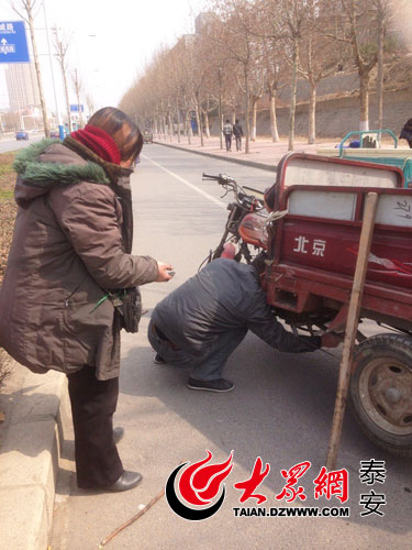 13日下午,在泰山大街泰安光彩大市场附近,泰安市民彭阿姨的三轮摩托车坏在了路边,“我自己骑三轮车出来,突然车链子掉了,我修了半天也没修上,幸好遇到了这位好心的大兄弟。”彭阿姨激动地说。