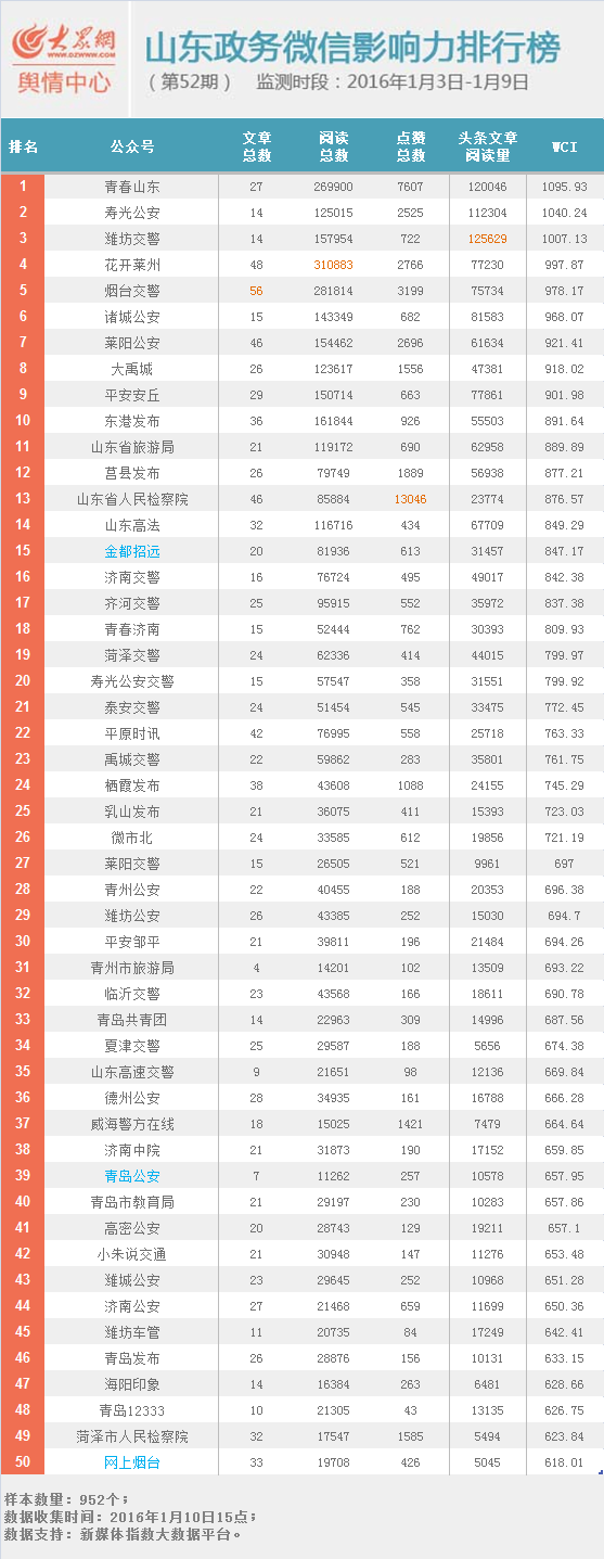 1月3日至1月9日,“青春山东”、“寿光公安”、“潍坊交警”名列前三甲,本期黑马为“泰安交警”(上期第48名,本期第21名),“金都招远”“青岛公安”“网上烟台”本期新入榜单。